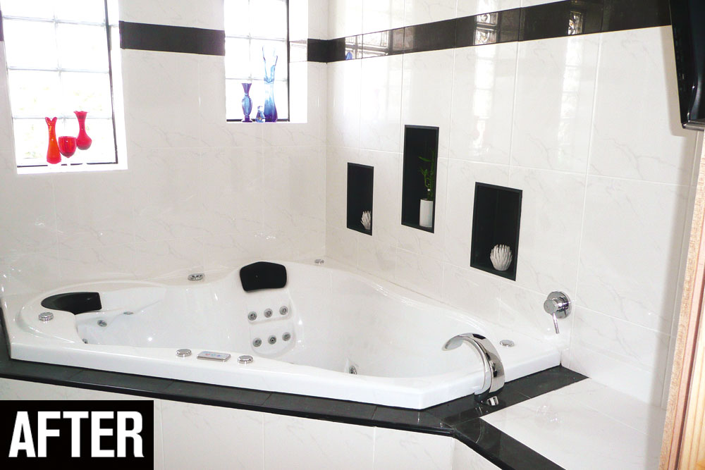 A toilet was installed opposite the shower, tucked behind the vanity, and the tub was replaced with a newer model with massage jets. Alan also added a flatscreen TV facing the bath.