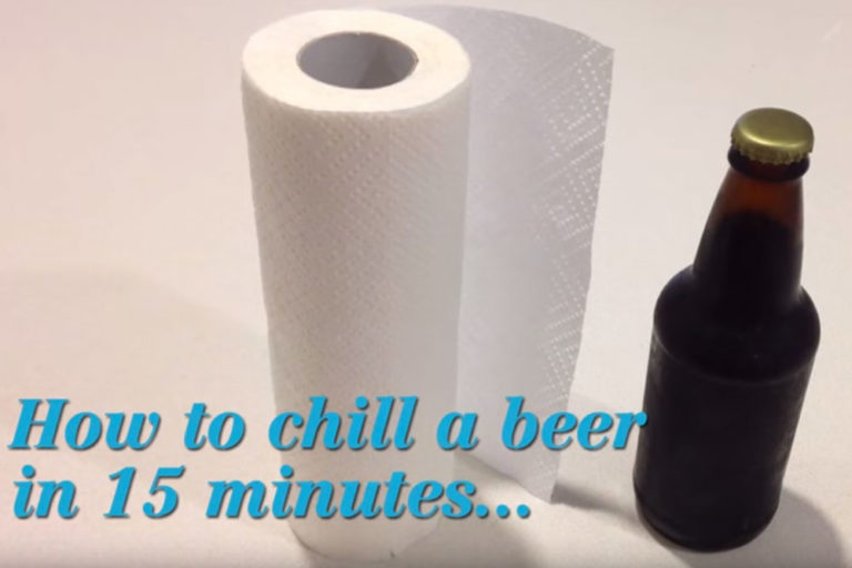 To cool the bottle of beer quickly, wrap it in paper towel and then wet it till the paper towel clings to the bottle before placing in the freezer for 15 minutes.