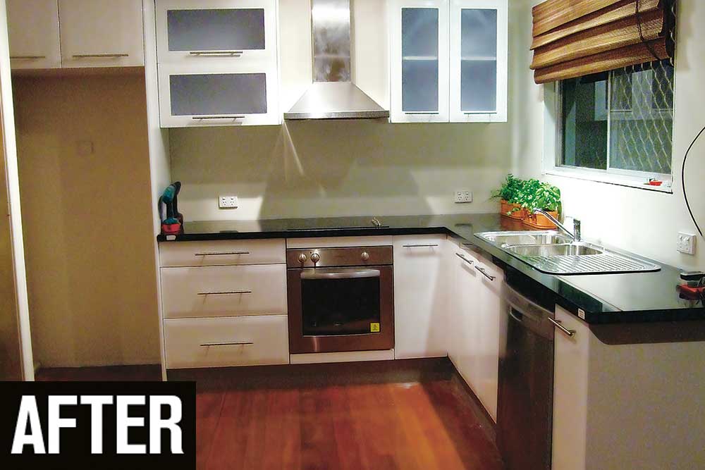 Everyone loves the new kitchen, which is now white with stainless-steel handles and appliances to match. We chose a black granite benchtop to complete the modern makeover.