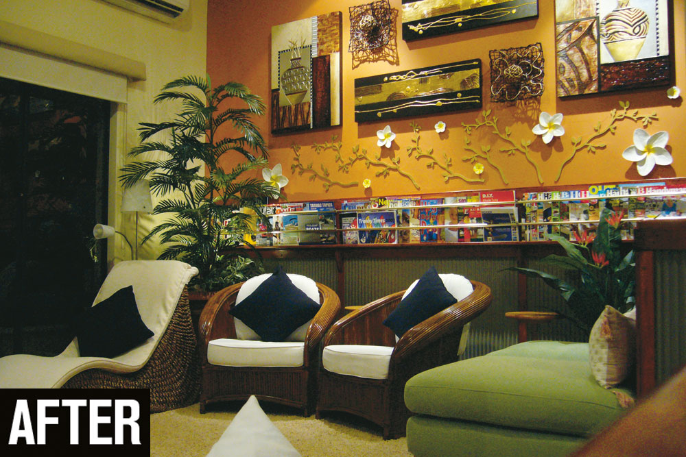 The original raw-timber, cabana-style space was transformed into a retreat with a magazine holder and comfortable space for lounging.